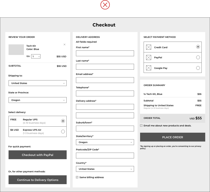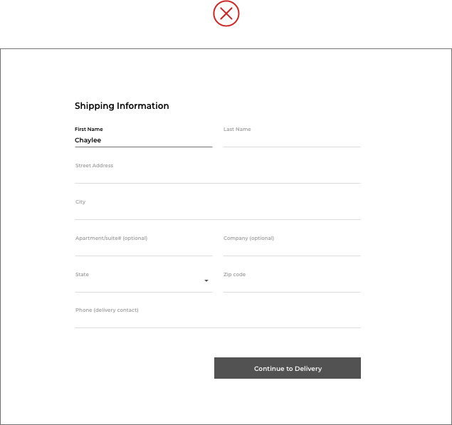- Reduce the amount of information you require. Less is definitely more in the case of checkouts. Users want it to be as quick as possible. Edit out anything that isn’t absolutely necessary (Do you really need their middle initial?). You can always ask for additional options for information after the sale.