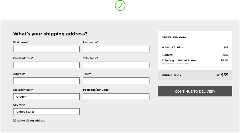 - Split the information into categories and then use those categories to create multiple steps. This can even happen on single-page checkouts – space information out in meaningful, intentional ways.