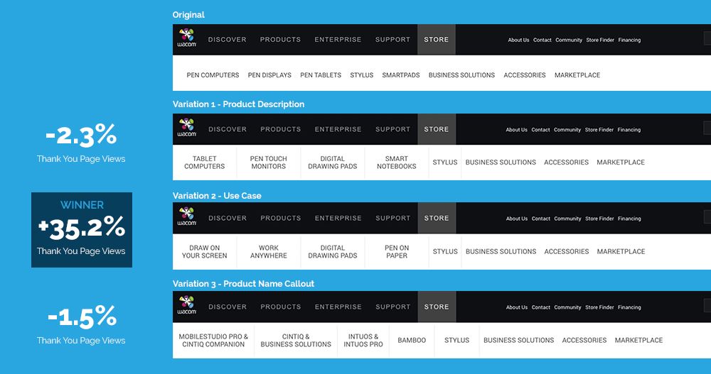 Example 2: Here’s an example of test we ran recently for Wacom. We were tasked with creating variations on their product category nomenclature. We tested 3 variations: More descriptive category names, categories based on use-case, and using the most popular products from each category. You can see that the “Use-Case” variation dominates the rest because it’s something familiar that resonates with them and how they use Wacom products.